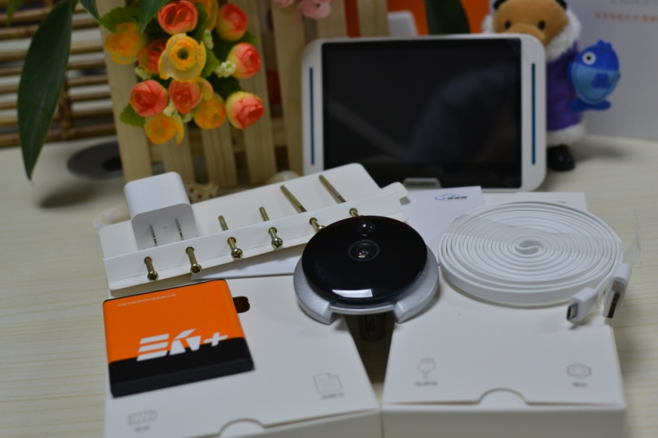 底层分列两个长条形包装盒,分别装着附电源适配器和电源线,输入为100-240V,输出为5V1A,采用USB接口,此USB接口为标配,替换性较好。三组长条形螺丝和电池,我们期待Smart K1有良好的续航能力。