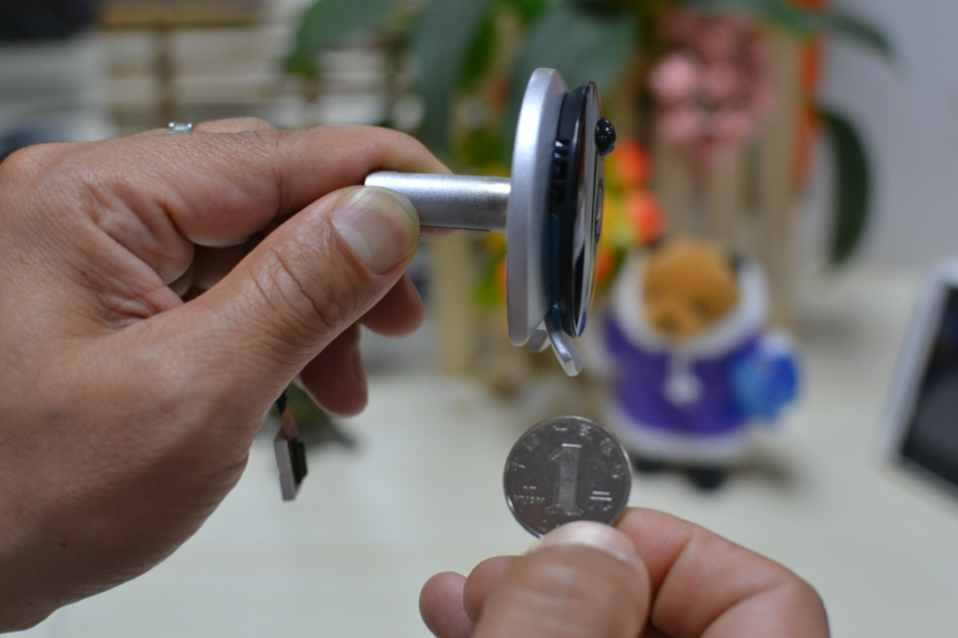 接下来,我们展示了两个重要组件,外部组件暂且称它为猫眼探视头,笔者相信当人们使用以后,会联想出更多有意思的命名或者称谓。猫眼探头以圆形锌合金作为底板,中间对称两个圆型孔,分别对应摄像头和PIR感应器,采用专业光学玻璃镜片,1/4〃CMOS传感器,实现110度超视广角,720P高清视频拍摄,让所有细节尽收眼底。