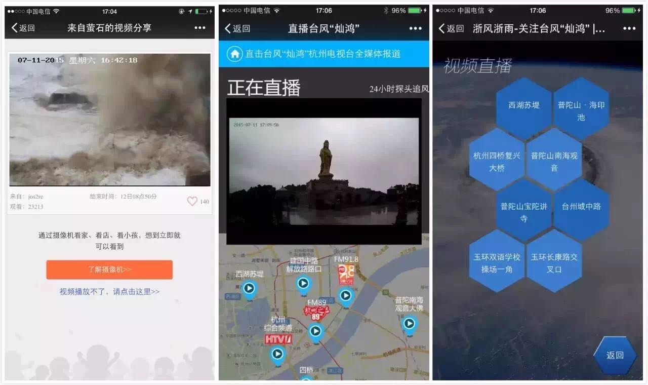 普陀山海印池、南海观音、宝陀讲寺、玉环市区、台州城中路等萤石13路摄像机,多点位、全天候直击台风“灿鸿”登陆前后24小时,为CCTV 新闻频道、杭州电视台、腾讯大浙网、浙江在线、杭州网等全国各大媒体提供稳定的一线视频直播信号。