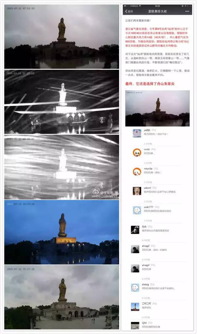 7月11日22:00,南海观音在狂风暴雨中已身影模糊,加之台风路径转移,自媒体称其为菩萨显灵,图片在微博广为传播,网友们也前往直播视频下留言,为浙江人民祈福。