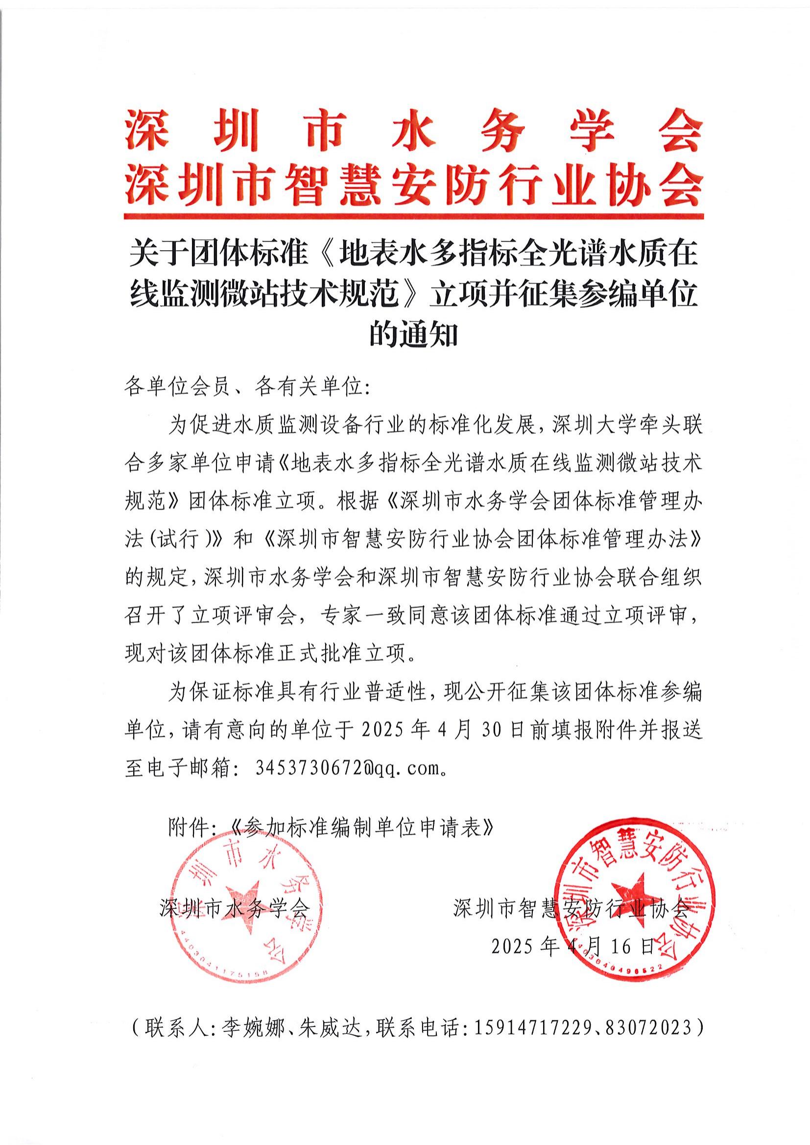 关于团体标准《地表水多指标全光谱水质在线监测微站技术规范》立项并征集参编单位的通知