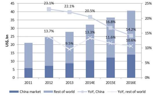 安全监控方面,高盛预计政府的“安全城市”和“智慧城市”项目将推动中国安全监控行业呈现快速增长。2014年国内市场增速约为20%,来自交通运输行业和学校、医院、博物馆等公共机构以及传统公共安全市场的需求强劲。高盛预计未来两年中国的需求增速将超过全球市场,并估算2014年中国市场规模约为100亿美元,全球市场总规模为320亿美元。