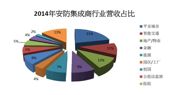 首先我们先来看一下2014年安防集成商的各行业营收占比:从图1的调研分析我们可以看出,平安城市的营收占比高居第一位,达到21%,其市场份额约为位居第二、第三位的智能交通、地产/物业之和。