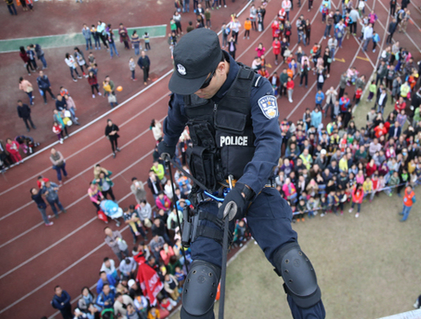 在主会场,反恐、灭火、救援、驾驶、警犬搜索抓捕技能演练,“特警训练营”、攀登、索降特种技能演练中,一众百里挑一的“精兵”向市民群众展示了其精湛过硬的特别技能,充分展示深圳警队打击违法犯罪、维护城市平安的坚定信心。特警、交警、公安边防支队组织的警种各型单兵装备展示也吸足了关注力,市民纷纷穿戴单兵警用装备拍摄留念。