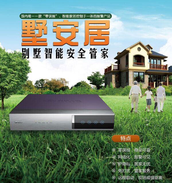 墅安居是目前国内唯一一款“零误报”报警、智能家居控制于一身的管家型报警产品,也是截止目前别墅用户唯一没有发生过被盗案件的别墅专用产品,并于2014年7月获得国家专利局对“零误报联网视频安防系统”发明专利授权。墅安居除了提供常规的视频、报警功能外,还提供业主出入记录、临时撤防、业主触发报警温馨提示、智能家居联动等功能,业主通过手机完全可视可控,真正起到了别墅安防“管家”作用。