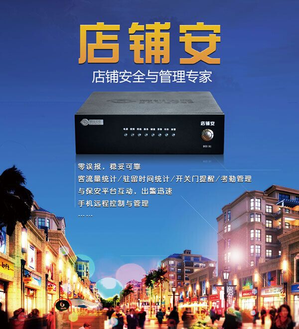 店铺安是国内首款店铺安防与店铺管理于一体的店铺智能防盗报警产品,也是全球首款跨界应用的店铺安防产品,不仅具备主动预警功能,具有可视化、零误报等特点,还因其客流量统计、开关门提醒、平均驻留时间统计等增值服务功能,真正实现了店铺防盗报警与店铺运营管理的统一。