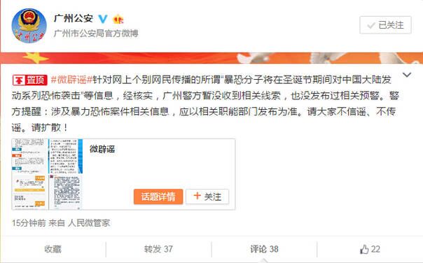 广州公安12月23日消息 针对网上个别网民传播的所谓“暴恐分子将在圣诞节期间对中国大陆发动系列恐怖袭击”等信息,经核实,广州警方暂没收到相关线索,也没发布过相关预警。警方提醒:涉及暴力恐怖案件相关信息,应以相关职能部门发布为准。请大家不信谣、不传谣。请扩散!