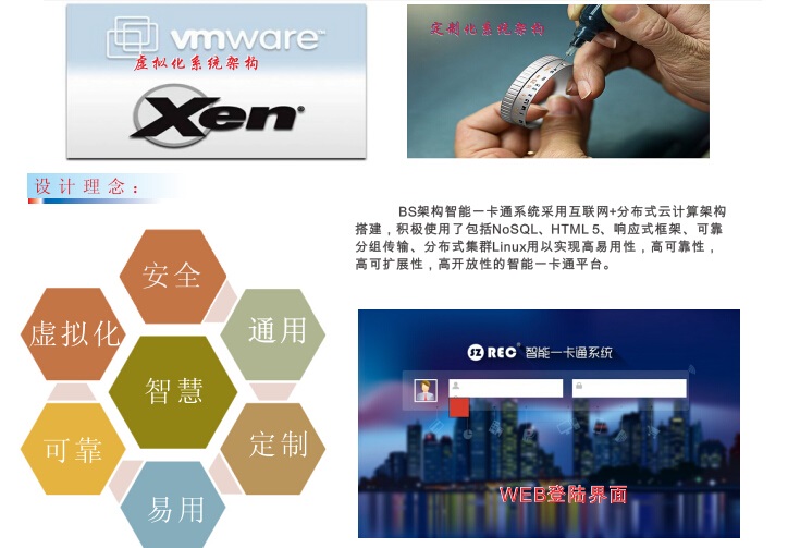 饶兴公司根据市场的需求,走在市场的前沿,前瞻性的开发出“金刚4G”B/S架构的WEB浏览器平台管理软件,B/S平台“金刚4G”以智慧,安全,通用,定制,易用,可靠,虚拟化的设计理念。采用互联网+分布式云计算架构搭建,积极使用了包括NoSQL,HTML5,响应式框架,分组传输,分布式集群Linux用以实现高易用性,高可靠性,高扩展性,高开放性的智能一卡通平台。