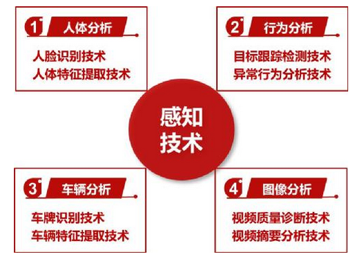 智能感知技术根据对象和目标的不同,可以分为四大类:基于人体分析的感知技术、基于车辆分析的感知技术、基于行为分析的感知技术和基于图像分析的感知技术。技术分类如下图所示: