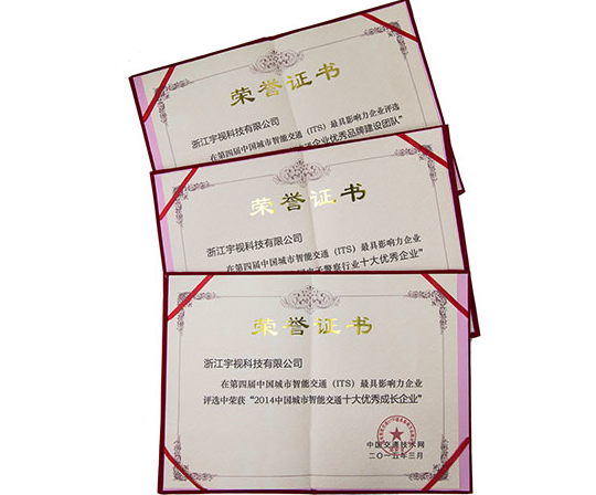 2015年3月,第四届中国智能交通市场(ITSMRS)年会在北京召开,宇视科技(Uniview)以率先实现千亿级大数据秒级精准检索与挖掘、90%的涉车破案率的实证、智能交通设备市占率前三甲的成绩,获得“2014中国城市智能交通十大优秀成长企业”“2014中国电子警察行业十大优秀企业”“2014中国城市智能交通企业优秀品牌建设团队”三项大奖。论坛由中国交通技术网(tranbbs)举办。