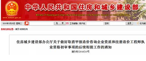 为贯彻落实《国务院关于第二批取消152项中央指定地方实施行政审批事项的决定》(国发[2016]9号),做好取消省级住房城乡建设部门对我部负责审批的甲级造价咨询企业资质和注册造价工程师执业资格(以下简称企业资质和个人执业资格)初审事项的后续衔接工作,现将有关事项通知如下: