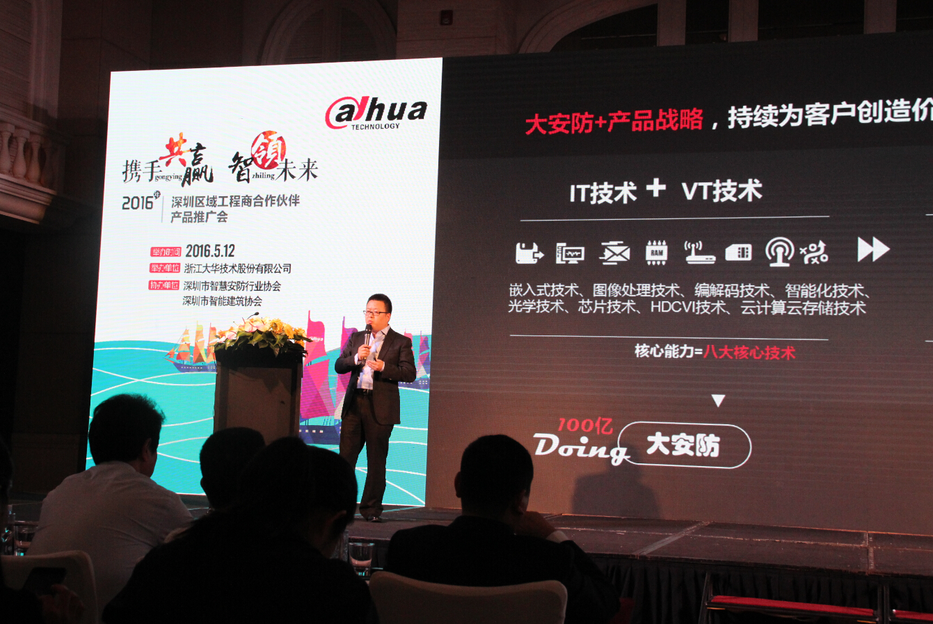 2016年5月12日,由浙江大华技术股份有限公司主办,betway下裁、深圳市智能建筑协会协办的“2016品牌巡展暨深圳合作伙伴大会”在深圳华侨城洲际大酒店隆重举行。本次大会以“携手共赢,智领未来”为主题,邀请了达实、赛为、星火等深圳知名集成商高层领导出席。此次活动共有500多位安防行业同仁参与,共同见证了大华2016年最新产品的发布。