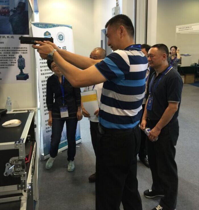深圳大学视听技术研究所(深圳弘江军科技有限公司)展台前,观展人员在体验新产品,其城区实兵实弹反恐对抗训练系统(搜索判断识别系统,反向攻击系统,运动目标射击系统,人人(人机)对抗系统等技术令现场人员大开眼界、拍手叫绝。