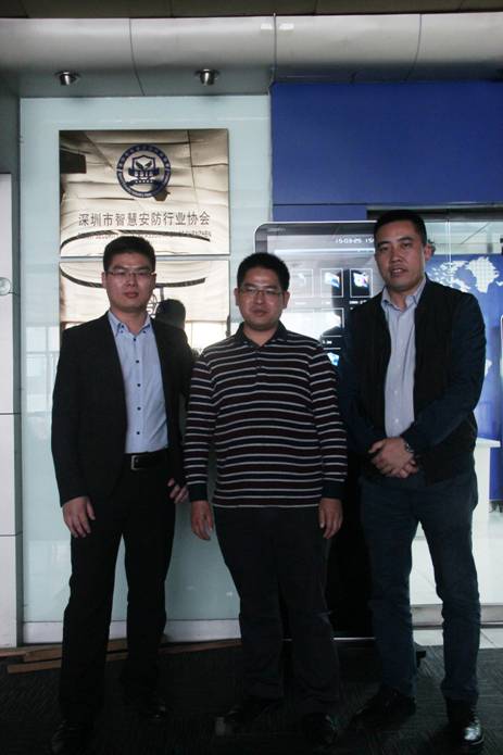 图为智安协副秘书长龙宇峰(中)与太平洋安防副总经理马修栋(右)、营销总监魏红建(左)合影