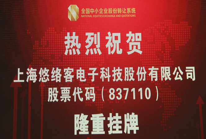 2016年5月25日,上海悠络客电子科技股份有限公司(股票简称:悠络客;股票代码:837110) 在北京全国中小企业股份转让系统举办挂牌敲钟仪式。悠络客董事长兼CEO沈修平先生莅临现场敲钟,公司高层领导共同见证了这一历史性的一刻。