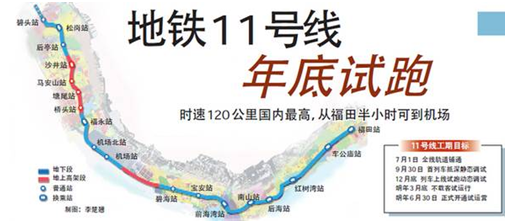 作为一条可以从市中心抵达宝安的新线路,最高时速达120公里每小时的地铁线路,比既有线运行的地铁列车提速了50%。11号线开通后福田中心区到机场仅需30分钟,是“目前国内最快时速的大编组地铁”,最为突出的是开创了国内在地铁列车上设置商务车厢的先河。6月底,该列车将行驶在身兼西部组团快线和机场快线双重任务的11号线上,正式为深圳人民服务。
