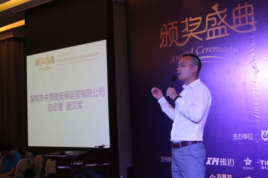 中海驰总经理唐汉军代表获奖企业发表感言。他表示,中海驰公司是国内领先的安保运营服务提供商,公司通过为数十万家企业、家庭客户提供创新技术与安保运营服务,为客户的人身、财产安全提供一个全方位的云端安全防范平台,为各中小企业、个体经营者的经营场所提供一个远程视频、报警联动、设备状态监测的管理平台,真正实现报警技术的革命性突破,解决了商铺、家庭、企业、公共安全、边防等报警可靠性、安全性问题。