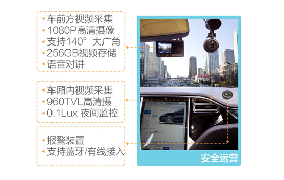 行车记录仪和车内专用摄像机保证了车内车前无死角监控,如乘车过程中发生事故、纠纷都可实时记录,设备配置大容量的存储空间,保证视频音频能够记录下来,让司乘人员远离纠纷;