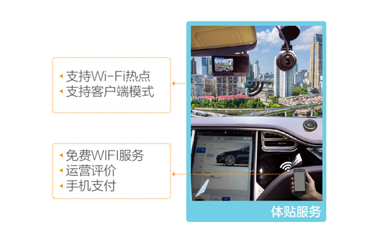 行车记录仪能够提供免费的WIFI热点服务,能够让乘客畅快上网,快速对网约车司机的服务进行点评,并支付车费。