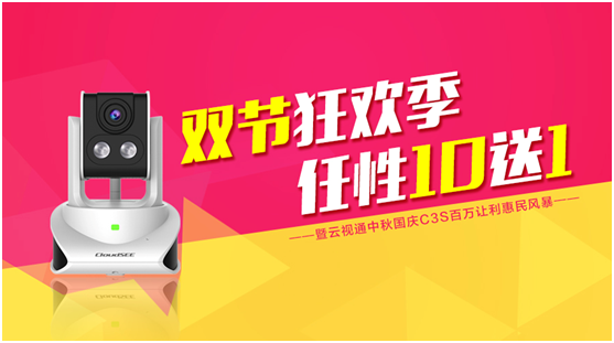 9月9日起,云视通品牌拿出最大诚意,重磅掀起 “中秋国庆狂欢季,云视通C3S任性10送1”的盛大感恩回馈活动!