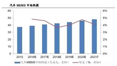 智能汽车和无人驾驶是驱动MEMS传感器发展的重要动力。在智能汽车时代,将会使用大量的MEMS运动传感器实现主动安全技术:语音将成为人与智能汽车的重要交互方式,MEMS麦克风将迎来发展新机遇。自动驾驶技术的兴起,进一步推动了MEMS传感器进入汽车。汽车行业占据整个MEMS市场份额超过30%,2015年全球汽车MEMS行业营收为37.3亿美元。根据Yole的预测,未来六年,全球汽车MEMS市场预计将以4.2%的复合年增长率稳步增长。
