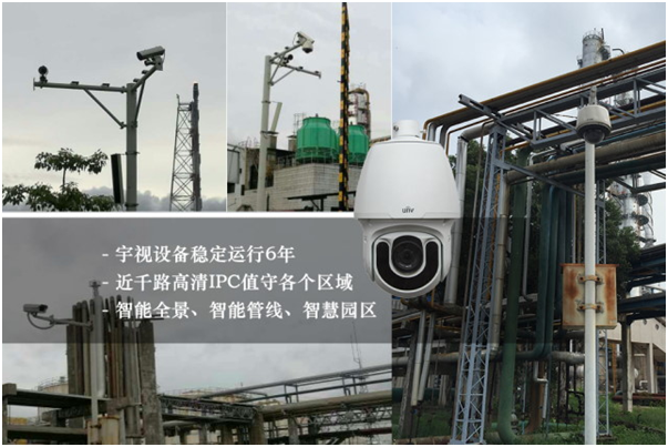 在占地近两万平米的茂名石化厂区,近千路宇视高清摄像机值守各个区域,特别部署的枪球联动,实现全景拼接;针对炼化园区面积大,设施设备分布广,在制高点部署监控设备,与区域节点监控互补,既可以分布画面巡视,也可全局查看,实现了整体与局部的协调联动,对园区形成全方位防护。同时配合GIS地图/3D可视地图一键切换定位,进行实时联动报警和可视化监控,对于突发事故实行可靠预警预案处理。