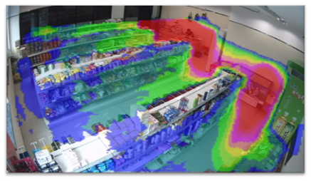 热度图技术(Heat Mapping)可以记录视频中一段时间内消费人群的运动情况,实现消费人群在时间维度上的密度检测,并利用不同的颜色在空间维度上进行展示。以下图为例,红色表示一段时间内顾客比较密集、停留时间比较长的货架区域,蓝色则表示相对人流较少的区域。这样,通过热度图分析技术可以帮助商家了解最受欢迎的商品类型以及将商品摆放在哪些位置可以增加选购的概率,从而提升销售额。