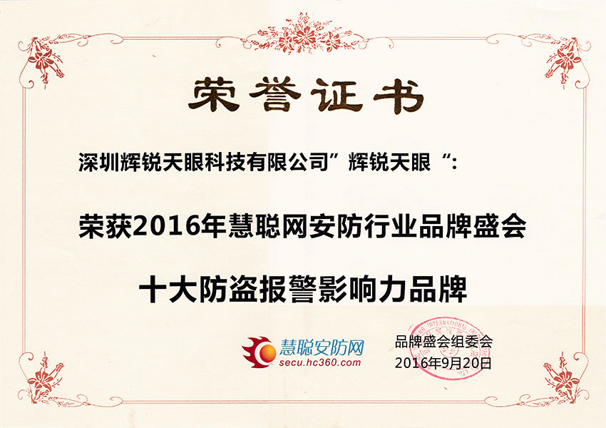 辉锐天眼荣膺“中国安防行业十大防盗报警影响力品牌”称号