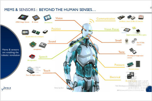 视觉方面,利用CMOS图像传感器、红外传感器以及微镜片装置等;视觉聚焦,利用数字式自动对焦装置以及微光学元件等;听觉方面,其实利用的就是各种麦克风装置;语言方面,利用微型扬声器;嗅觉方面,利用气体/气味传感器;味觉方面,利用温度和湿度传感器;触觉方面,利用压力或触觉传感器;位置方面,惯性器件和电子罗盘;通信方面,利用振荡器、调谐器、滤波器以及交换器等;此外,再利用压力传感器及电学传感器构建机器人的其他系统。