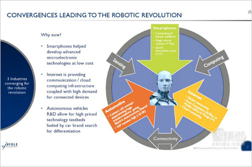 由于智能手机的发展使得微电子技术的成本得以下降,联网设备对互联网的高度依赖又带动了通信和云计算基础架构的完善,自动驾驶技术的研发也为汽车品牌古老而高昂的技术开发带来了差异化的方法。这些技术的充分发展及互联互通都使得机器人产业充分收益。