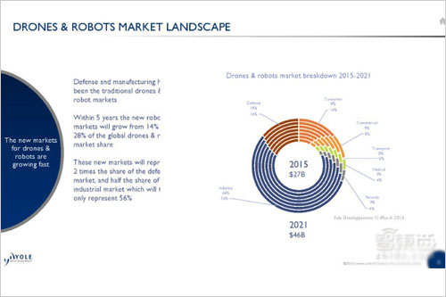 下图反映了2015年到2021年机器人/无人机总体的市场空间,以及细分市场所占的份额。其中国防和工业是无人机和机器人产业传统的市场方向。而更加引人注目的是其他几类的新兴市场将会迎来快速发展,这些细分市场包括消费级市场、商用、医疗及安防市场。这些新兴市场的所占份额的总和将会在2021年翻一倍,达到28%。同时,这一数字也将是届时国防市场份额的二倍。而总体份额的56%依然还是属于工业范畴。