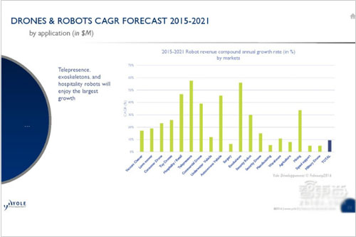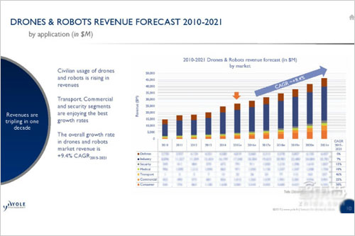 下图表现了2010年到2021年的机器人/无人机市场营收情况。根据预测,到2021年,整个市场将会以9.4%的复合增长率持续增长。