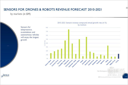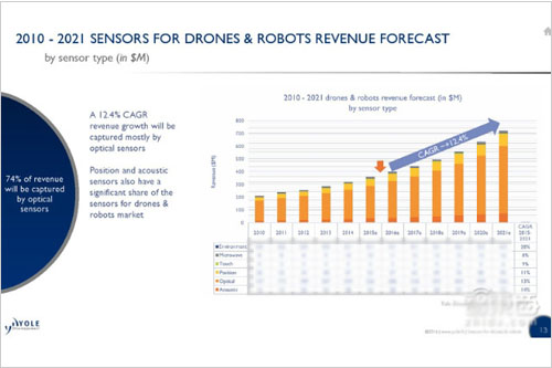 上图表现的是2010年到2021年机器人/无人机行业传感器的营收情况。根据预测,到2021年,传感器市场的复合增长率达到12.4%,高于整机市场9.4%的增长率。