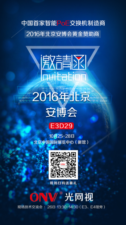 2016年10月25日-28日期间,备受关注的2016年第十三届中国国际社会公共安全产品博览会(简称“安博会”)将在北京隆重举行。ONV光网视作为中国首家智能PoE交换机制造商,届时将携PoE交换机系列、工业级PoE交换机系列、光纤收发器系列、PoE分离器系列、PoE供电器系列、核心汇聚交换机等产品盛装出席安博会现场,于北京·中国国际展览中心新馆E3D29向观众展示ONV光网视13年成长之路。