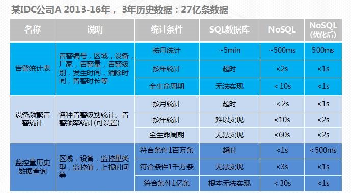 以数据中心为例,一个IDC每天可以产生168万条数据,仅告警种类就超过3万多种。如何完成所有的数据分析?仅建立一个符合几个条件的分析模型,就可能需要花上几天的时间才得出结果。如果要同时符合上万个条件,比如,分析一个造成空调过载的触发因素,需要在一个2万多个数据条件的情况下分析。在过去的SQL条件下这只是一个梦,而中兴力维采用了NoSQL方法,可以把过去不可能的事,在1-2秒内实现。