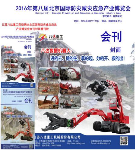 作为北京防灾减灾应急产业博览会最重要参展支持赞助单位之一八达重工机械股份有限公司起到关键性作用,同时也回报八达公司走上国际舞台,八达公司连续2015,2016年登刊防灾减灾应急大会会刊封面权,让我们一起来了解八达重工机械股份有限公司情况,公司成立于1993年,2006年迁入江苏省新沂经济开发区。2012年9月完成股份制改制,注册资本5573万元,并于当年10月31日在天津股权交易所挂牌上市。公司为国家火炬计划重点高新技术企业、江苏省创新型企业,是国内唯一研发、制造、销售“双动力”特种工程物流机械、大型抢险救援机器人的厂家。主要产品有:“双动力”全液压轮胎式、履带式抓斗起重机和抓料机,以及大型装卸、拆除、抢险救援机器人等。