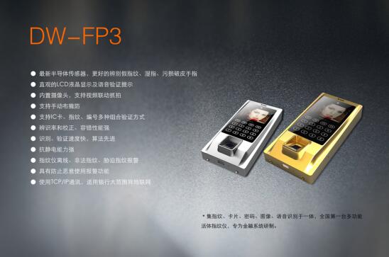 DW-FP3 全国第一台多功能活体指纹仪,集指纹、卡片、密码、图像、语音识别于一体。