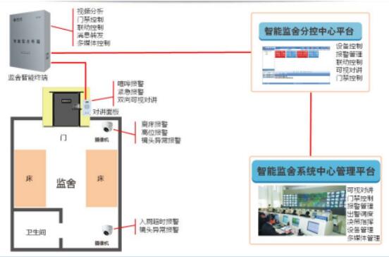 在监舍视频监控的基础上,加入了嵌入式的视频分析技术,对“夜间离床”、“徘徊”、“高位报警”和“入厕超时提醒”等行为作出智能判别和报警推送,结合传统的“喧哗报警”、“主动报警”等,加之视频、对讲的整个应用,形成了科学、及时、完整全面的监舍行为异常防范机制,有效防止监舍内的“非正常”事件发生。