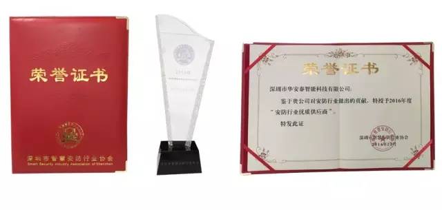 华安泰荣获“2016年度安防行业优质供应商”荣誉证书