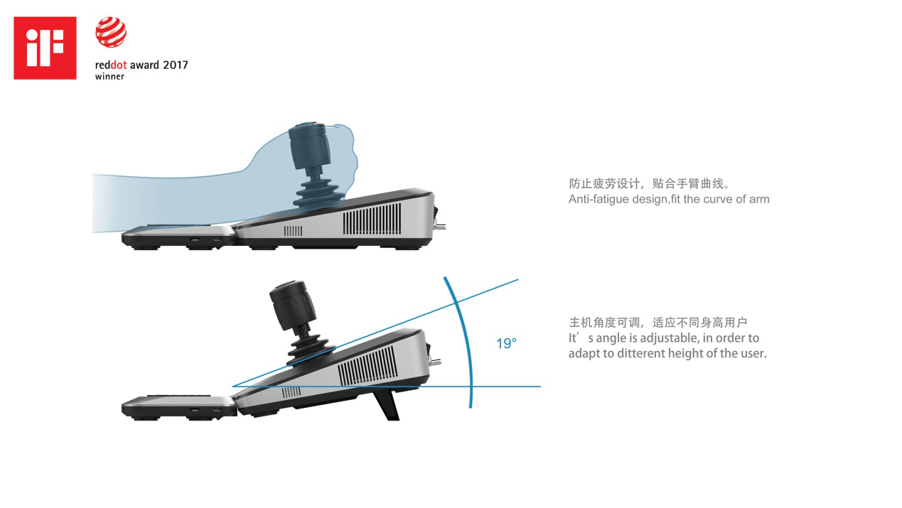 这是一款适用于平安城市多种场景(如公安、交警、商场、智能楼宇等监控场所)的超高清解码网络键盘。产品经过多场景人机模拟测试,打破传统的网络键盘厚重的形式,外观上运用了分体式的设计,造型的曲线完全贴合手臂,通过硬件和软件的创新,来实现更高的通用性和舒适性。产品在拥有精巧外观的同时,具备了强大技术支持,集成了pad、摇杆、键盘等功能模块。技术上,它支持液晶屏显示及4路HDMI同时解码输出,支持H.265和4K解码,支持WiFi及蓝牙连接。
