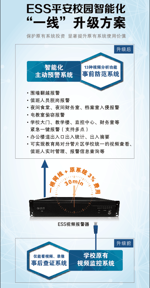 ESS平安校园智能化“一线”升级方案是用一根网线将辉锐天眼的视频报警器与学校现有的视频监控系统连接,即可将现有的视频监控系统升级为带13种视频分析报警和服务的主动预警系统,实现任何报警7秒钟到校园主管领导手机和门卫值班室,基本实现了校园安全业务的“无缝隙”全覆盖。且升级只需30分钟,花费只需原有系统3%的费用!在保护原有投资的同时最大限度的提升了原视频监控系统的使用价值。