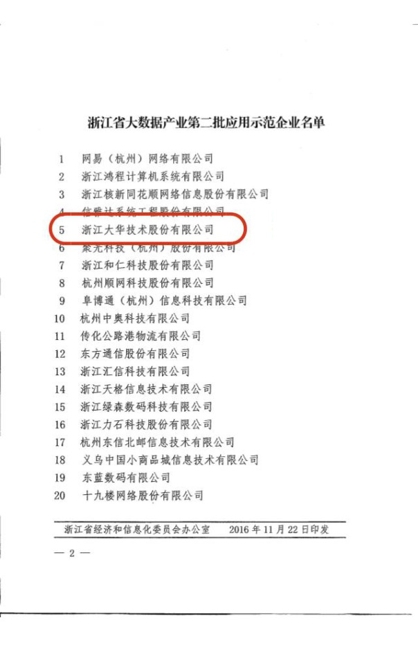 浙江省经济和信息化委员会公布了浙江省大数据产业第二批应用示范企业,大华股份经过层层筛选和严苛的专家评审,从数十家企业中脱颖而出,与网易等二十家企业成功入选。