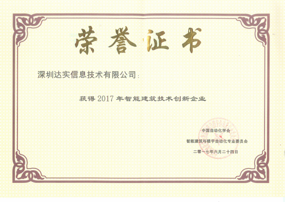 近日,达实信息荣获“2017年智能建筑技术创新企业”称号,该荣誉由中国自动化学会及智能建筑与楼宇自动化专业委员会颁发。
