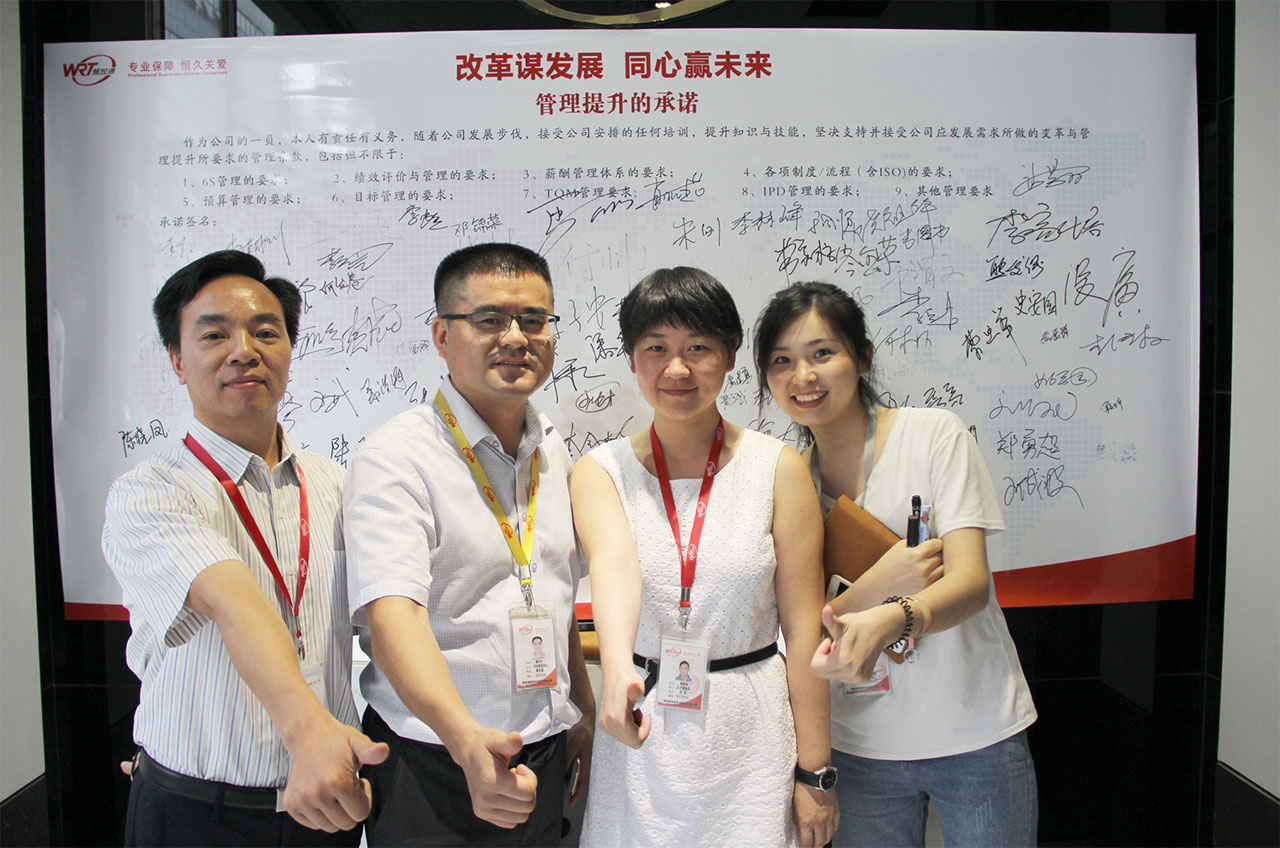会议首先是人事任命仪式,这是公司对人事变革的第一步。市场运营总监曹忠举先生、董事长助理兼人力资源总监姜本于先生先后发表了就职演讲。姜总表示时代正经历着前所未有的裂变,每一个企业、个人都面临着很多的挑战和困难,阻碍我们持续增长的根本原因就在于思维障碍和既得利益,这就是我们要改变的原因。随后公司高管层紧密地站成一排,进行工作作风宣誓。作为公司的领导核心,要正人须先正己,以身作则,带领慧锐通全体成员一起昂首迈进2018管理提升年。最后慧锐通全体成员在管理提升承诺墙上签名表决。