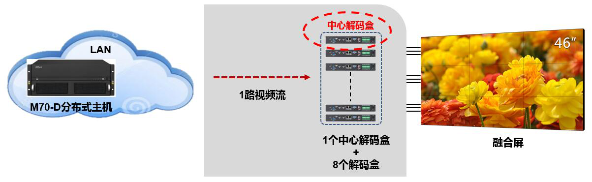 当分控中心电视墙需要做一个3*3的融合屏时,采用传统模式需要从分布式主机拉取9路相同的视频源。而大华新一代分布式拼接控制系统,将其中1个普通解码盒替换为中心解码盒,就能从原来需要9路视频源降低到只需要拉取1路视频源,有效降低网络带宽压力,缓解高清视频网络传输带宽不够的矛盾,着力解决观看视频出现画面不流畅、卡顿等问题。