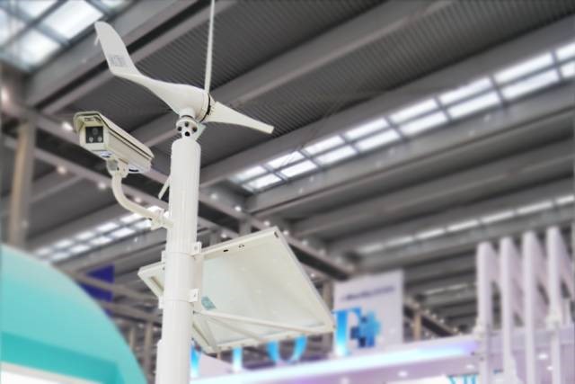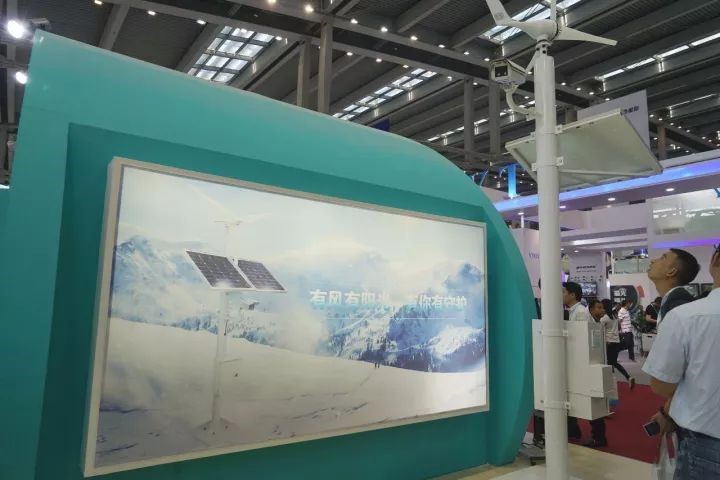 万佳安首推第一款亮点产品便点这款高耸直立的风光互补室外一体机,它矗立在展台足有3米高,远远看上去便是一道亮丽的产品风景线。