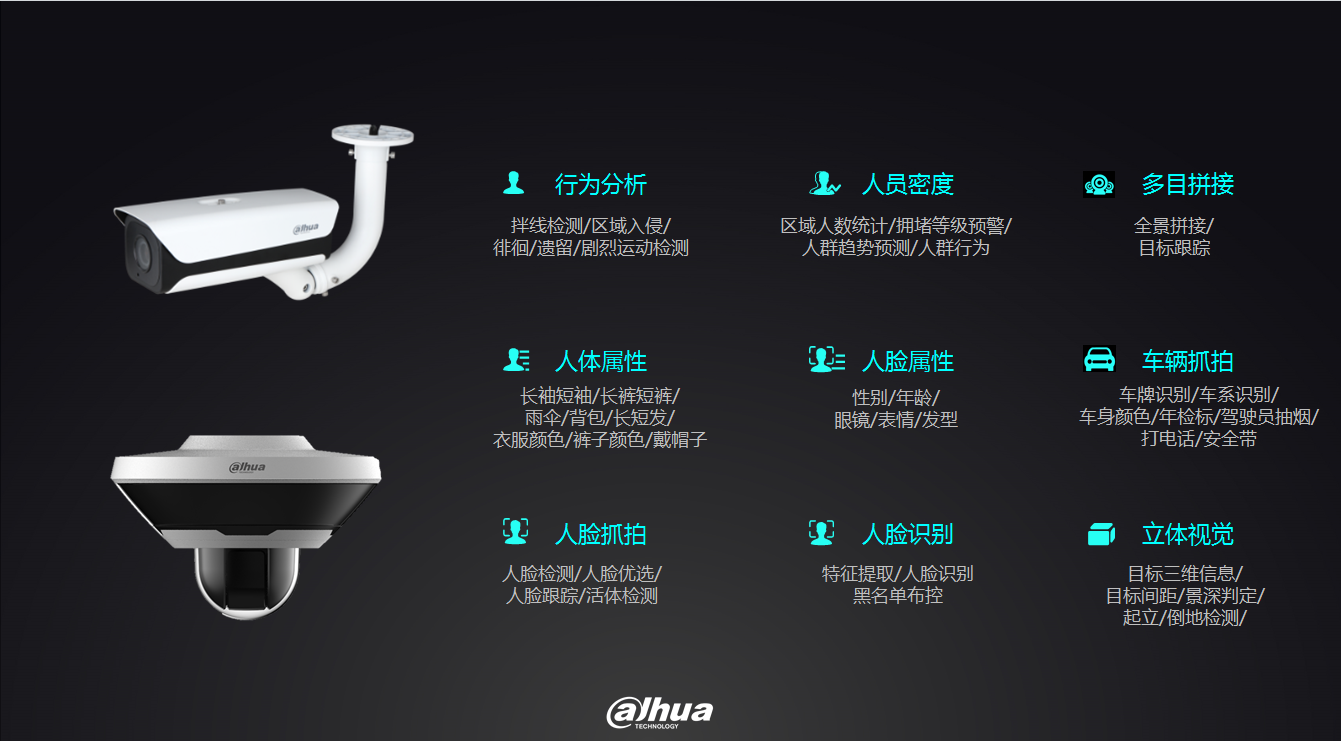 大华在人工智能领域收获颇丰,推出了“睿智”系列前端摄像机和视频结构化服务器。“灵瞳”一体化摄像机可实现全景统筹细节捕获,支持8种人脸属性、8种人体特征、1万人脸库实时比对;“慧”系列交通摄像机全球率先采用全局曝光CMOS,900万像素业内最大靶面;“睿智”视频结构化服务器采用NVIDIA P4方案,最高支持192路1080p视频结构化分析,将复杂场景中的人、机动车、非机动车实时提取分析。这些产品的快速迭代和成功应用, 实现公安部门对于视频布控预警、实时指挥、视频侦查、情报收集等多种实战应用需求,将传统的事后反查应用模式向事前预警模式转变,对金融、楼宇、司法等行业智能化建设也同样具有重要意义。