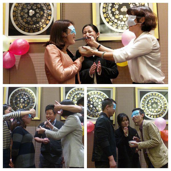 “蒙眼觅食”游戏:3人一组,1人负责戴眼罩喂食,1人戴眼罩吃,1人负责在旁边指导。有些参赛同事配合默契,有些则总是吃不到食物,参赛同事着急逗趣的模样让大家捧腹大笑。