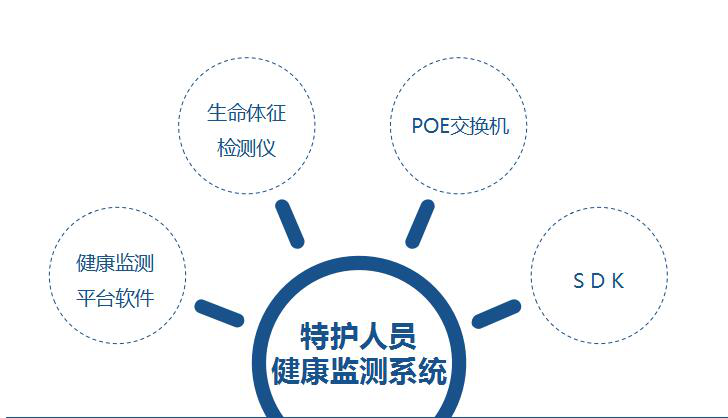 特护人员健康监测系统由平台软件(架设于监管场所指挥中心的服务器中)、生命体征检测仪(部署于特护人员床位)、POE交换机(部署于监仓外)组成,同时提供SDK开发包支持第三方平台接入。