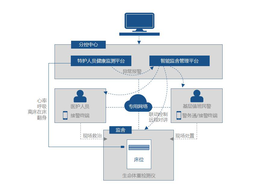 平台软件指的是特护人员监控监测系统,部署于服务器并通过专用局域网与被监测人员床上的生命体征检测仪连接,采集汇总各检测仪检测的数据,并将检测数据与监控视频、人员信息等数据整合,提供直观的图形界面供管教人员及时了解被管控人员的实时健康指标和动态变化状况。
